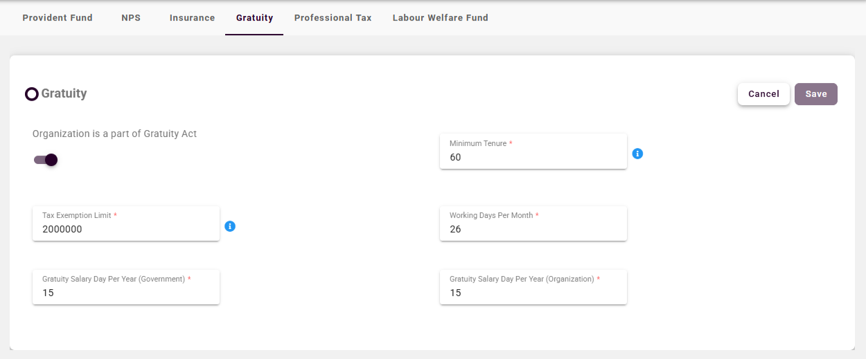 Navigate to Tax and Statutory Compliances → Statutory Components → Gratuity