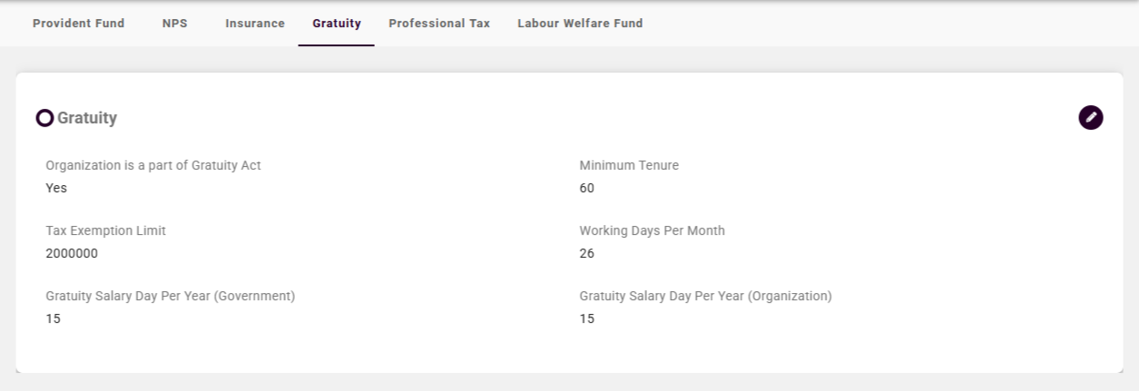 The calculation formula in the Gratuity settings is pre-defined as: Last Drawn Basic × 15 ÷ 26 × Completed Years of Service.
