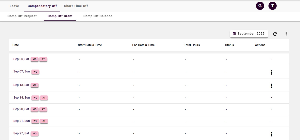 Based on the employee’s work schedule, week off policy and applicable holidays, the system automatically displays the list of eligible week off and holiday dates in the Comp off Grant module.