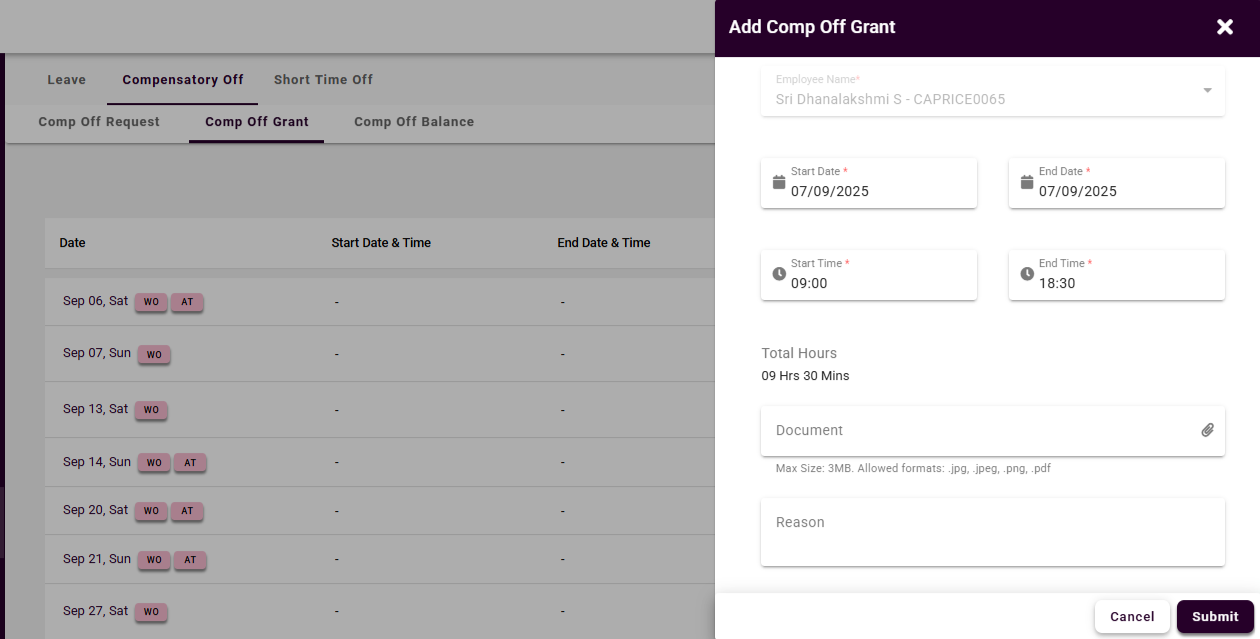 To apply for a comp off grant request, click the three dots in the Actions column and click Add. A pop-up window will open, where employees must fill in all the mandatory fields and submit the request.