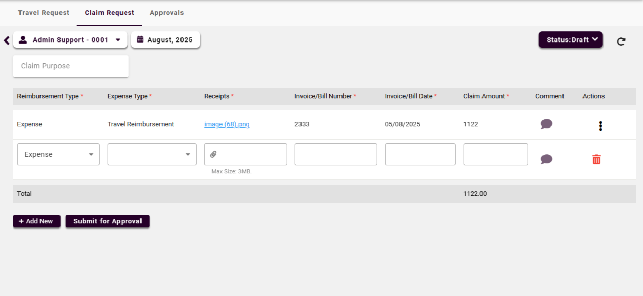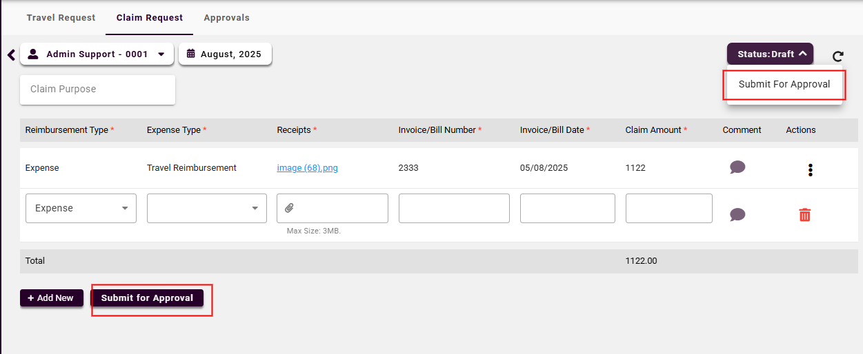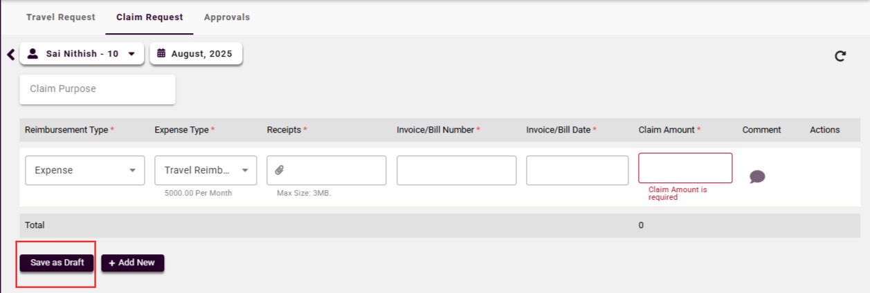 Save as Draft: If the claim is incomplete or pending receipts, it can be saved as a draft.