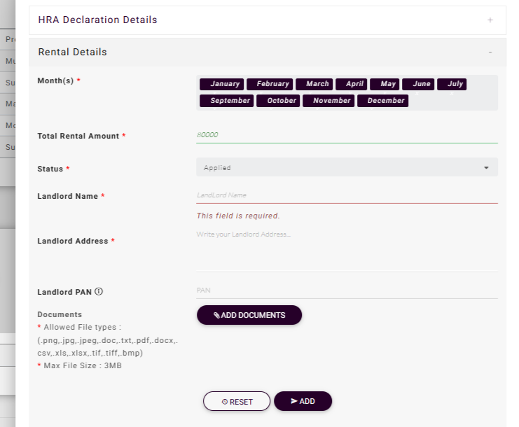 A pop-up will appear to enter the Month, Total Rental Amount, Landlord Name , Landlord Address and if the Rental amount per annum is more than Rs.1,00,000/- then application will enforce the Landlord PAN.