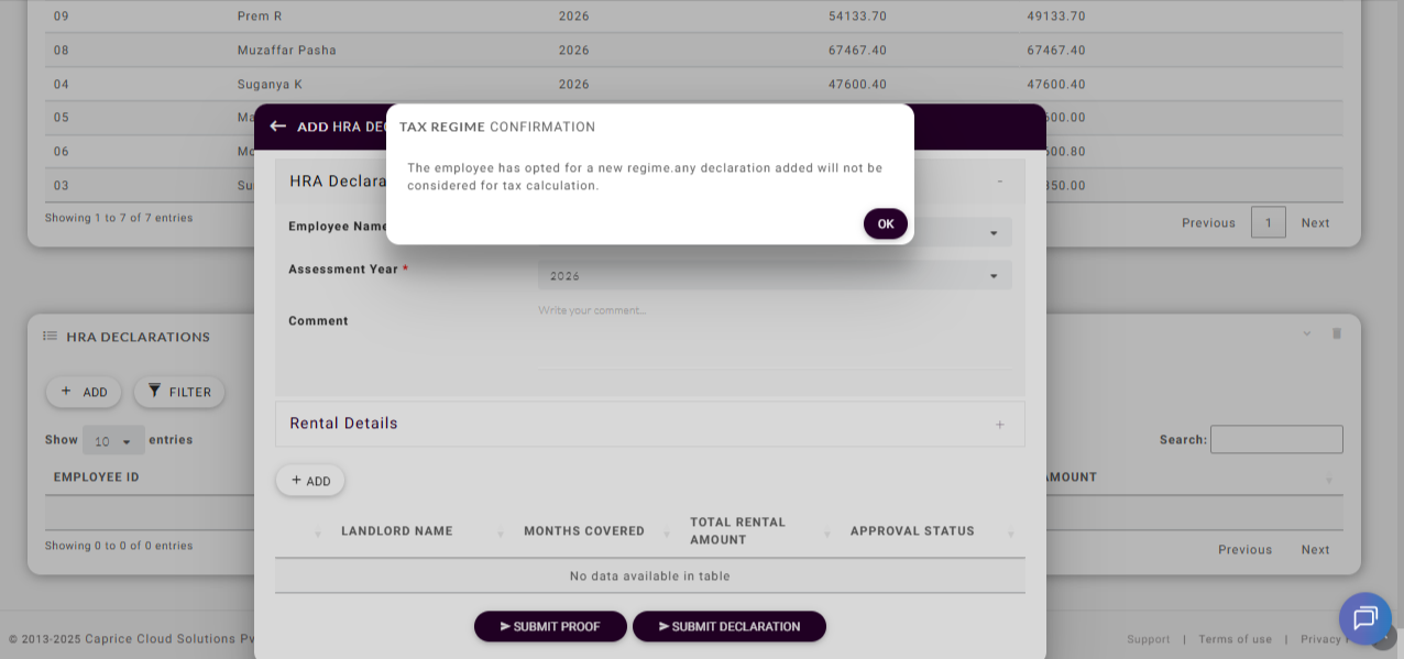 A pop-up warning will appear if the employee has chosen the New Regime, stating that declarations will not be considered for tax exemptions.