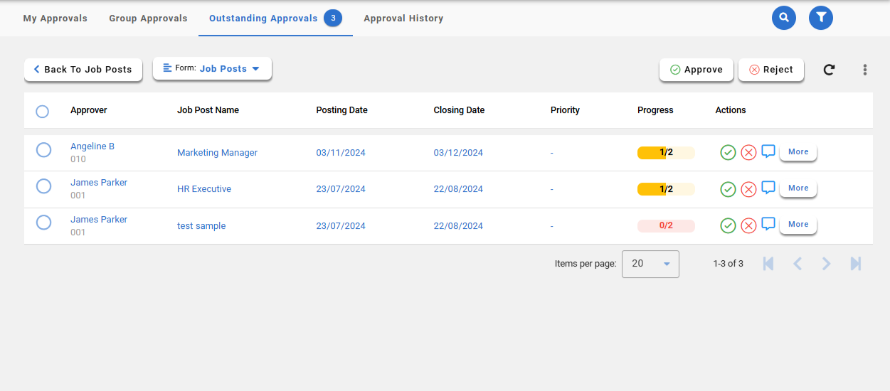 Status | Statuses indicate the current stage of a job post, task, or request in the workflow process. Approved: The job post or request has been reviewed and granted official approval by the relevant authority or team. Waiting for Approval: The job post or request is pending review and has not yet been approved. Open: The job post is reviewed and approved |