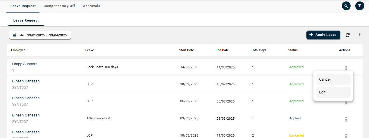To edit a leave request: Click the Three Dots in the Actions column and select Edit.