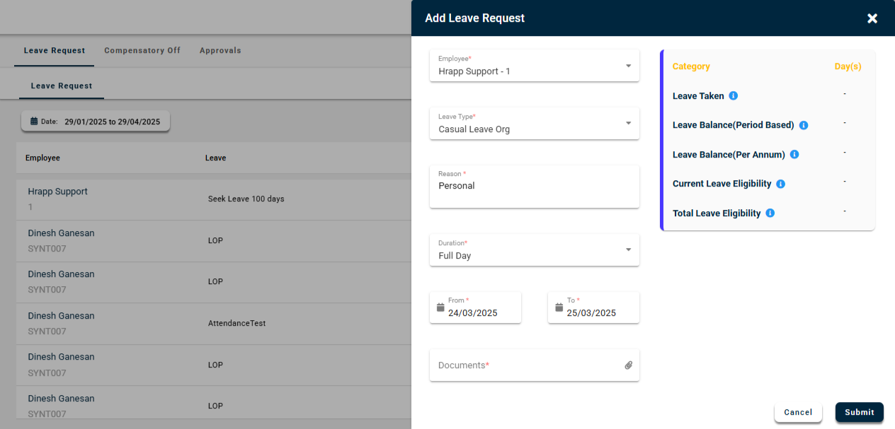 To apply for a leave request, click the +Apply Leave button on the right-hand side. A pop-up window will open, where employees must fill in all the mandatory fields and submit the request.