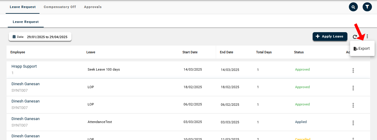 To download the leave register report click the Three Dots in the right hand side above the Actions button and click the Export.