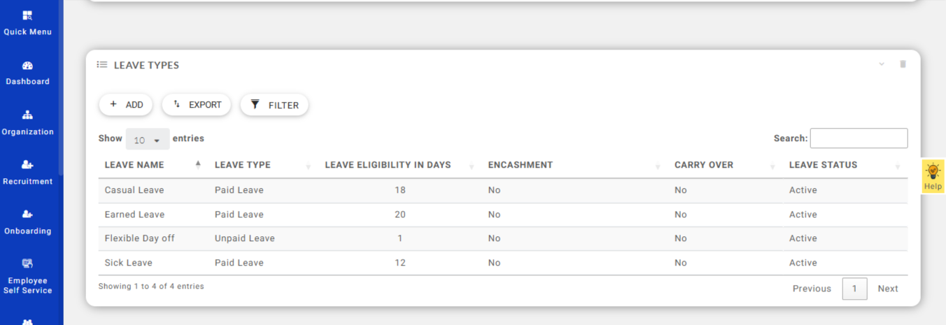 To configure the leave policy for different leave types, click the Add button.