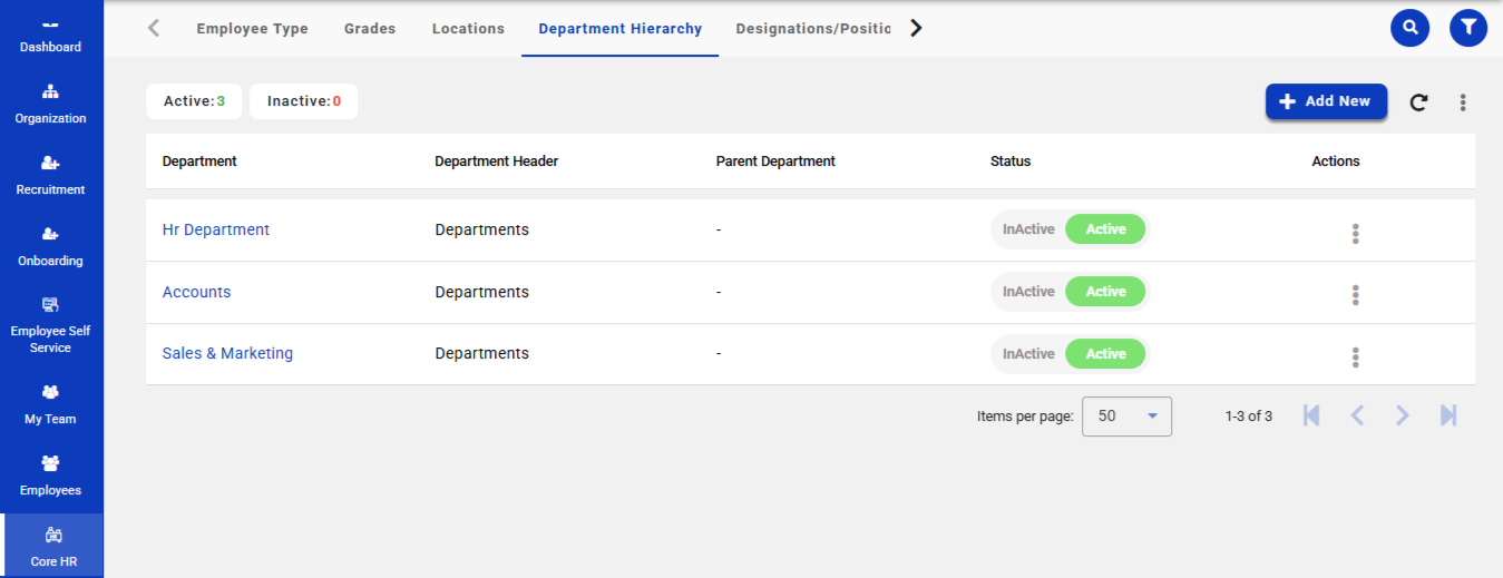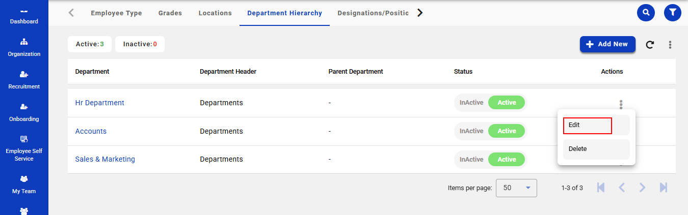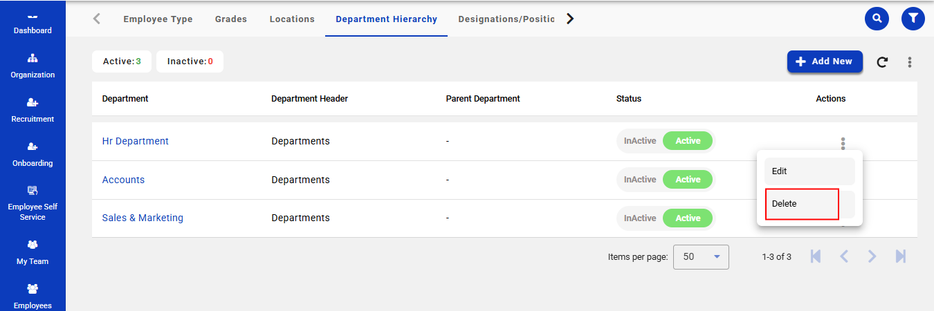 If a department is associated with employees, it cannot be deleted directly. First, you must update the department for those employees. Once no employees are linked to it, you can proceed with deletion. To delete a department, first set its Status to Inactive, then click on the Three Dots in the Actions column, select Delete, and confirm by clicking Yes.