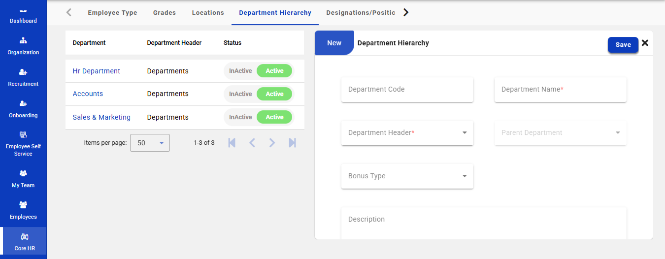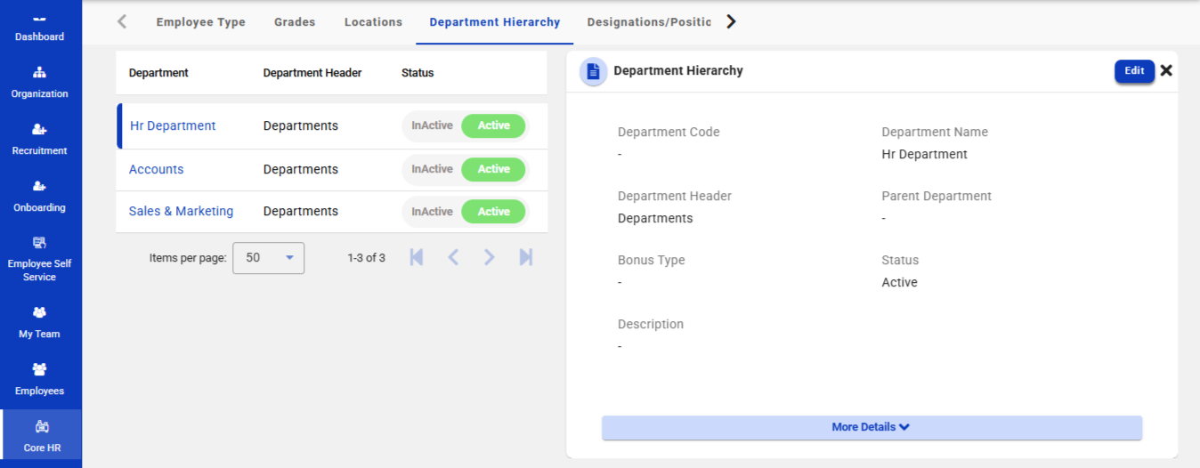 - Navigate to CoreHR → Org Structure → Department Hierarchy