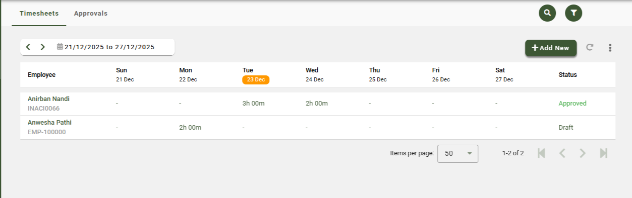 To add a timesheet on behalf of an employee, click the + Add New button.