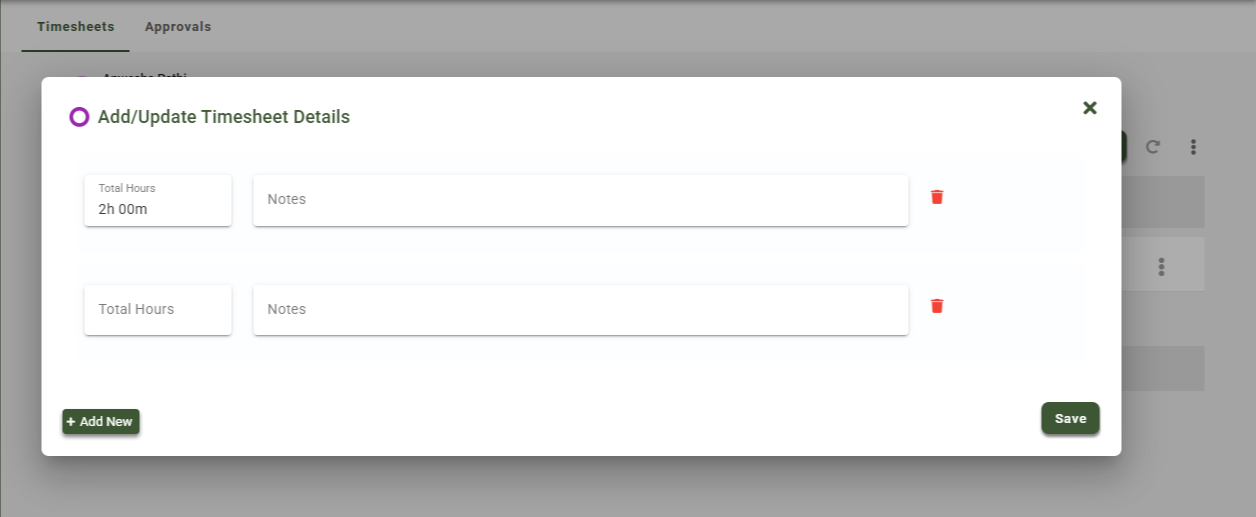 To add additional hours or notes for the same project and activity, click + Add New, provide the details, and click Save.