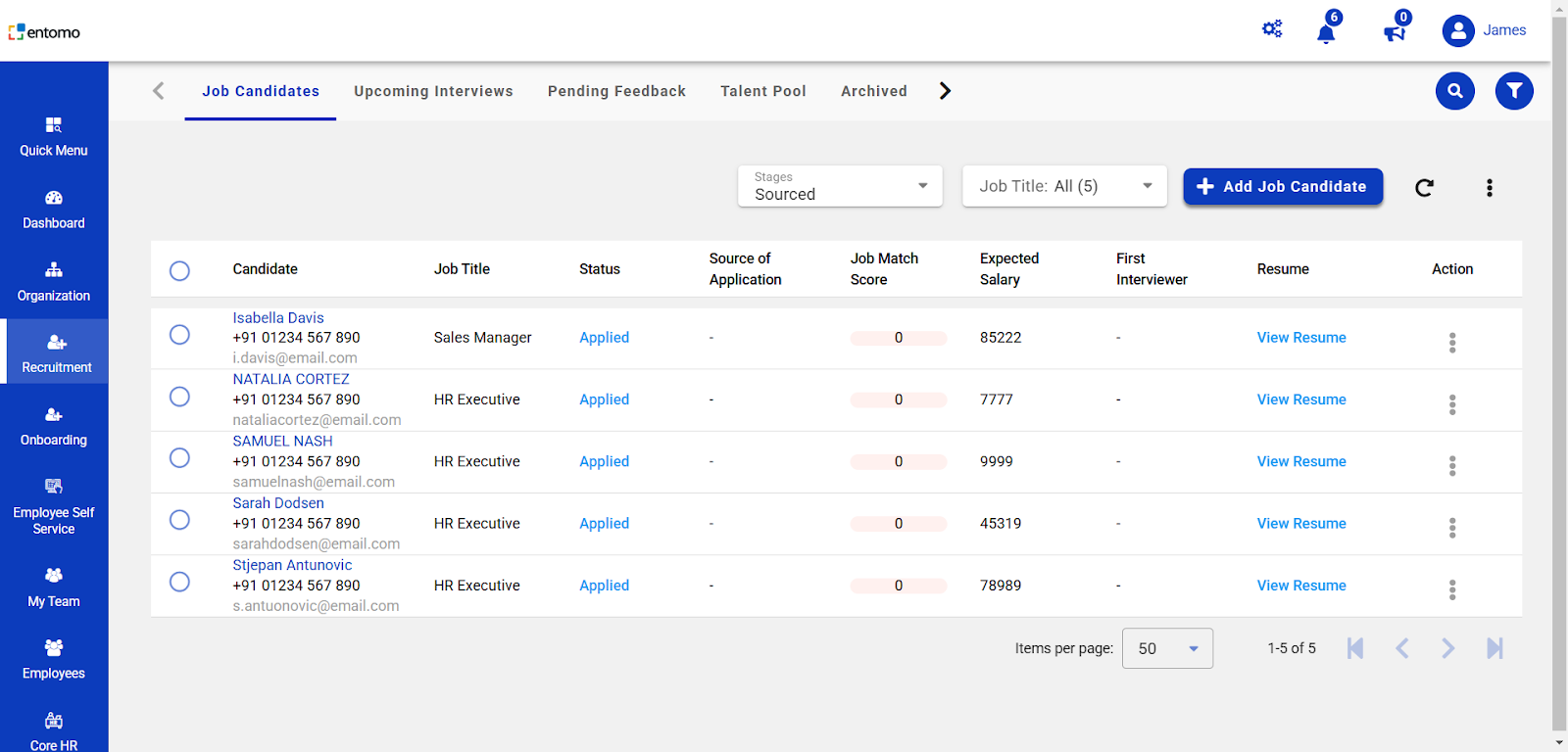 All resumes submitted through various portals are consolidated within the Job Candidate module.