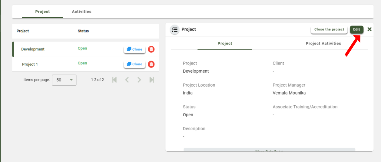 Once a project is created and activities are associated, the project status will be displayed as Open.
