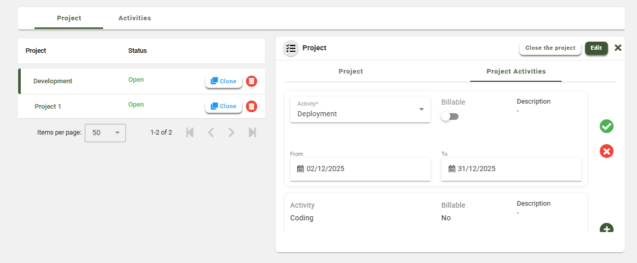 To add new activities to an existing project, select the project from the grid and click the Edit button. Navigate to the Project Activities tab, click the + icon or Add New button, associate the required activities, and click the Tick (✔) icon to save.