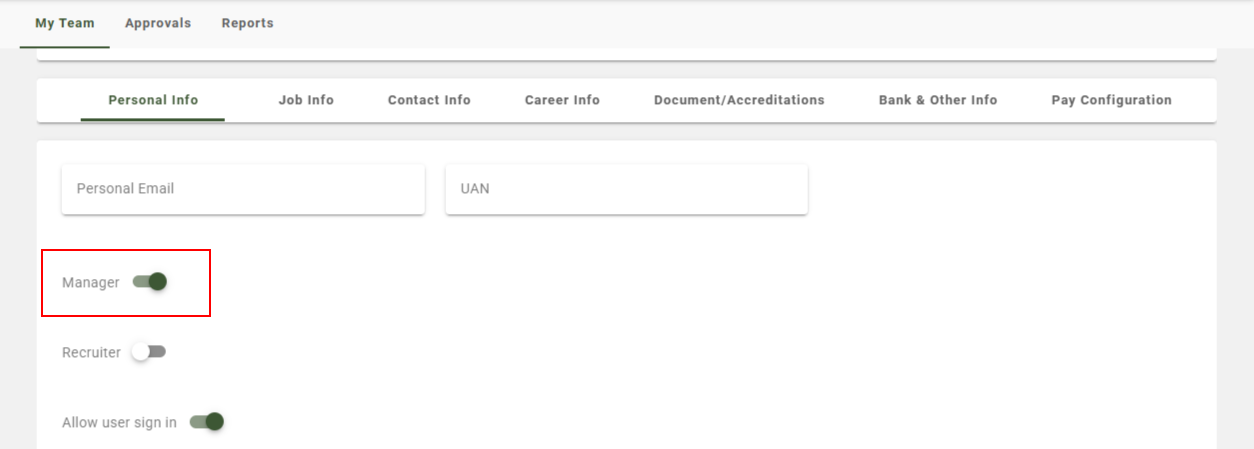 Navigate to My Team → Team Summary → Select the employee and enable the Manager flag.
