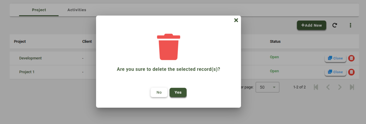 To delete a project, click the Delete icon in the project grid and confirm by clicking Yes.