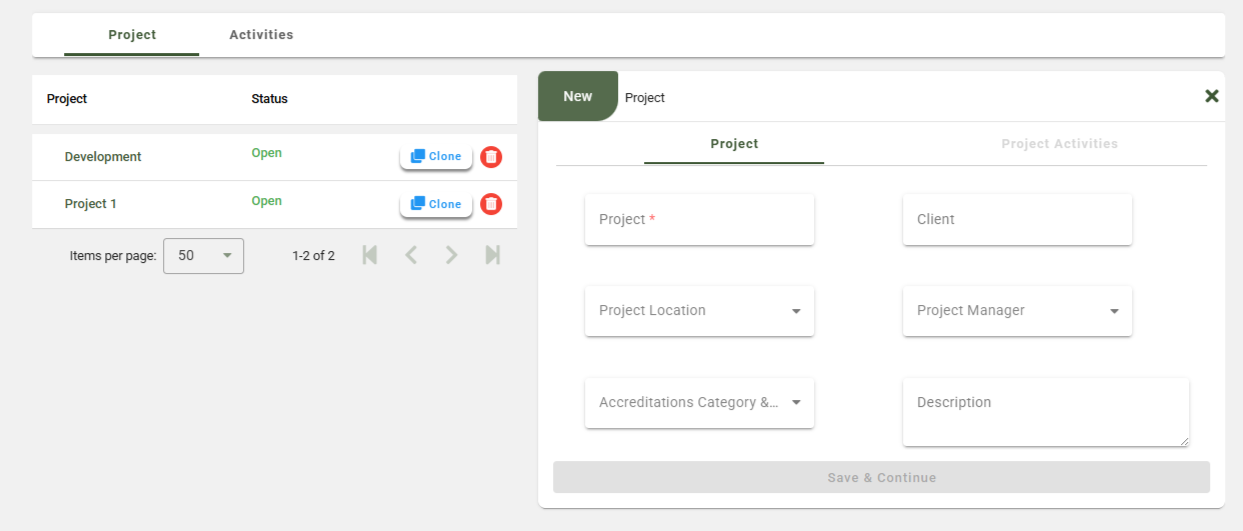 Click Save & Continue, which will navigate you to the Project Activities tab.