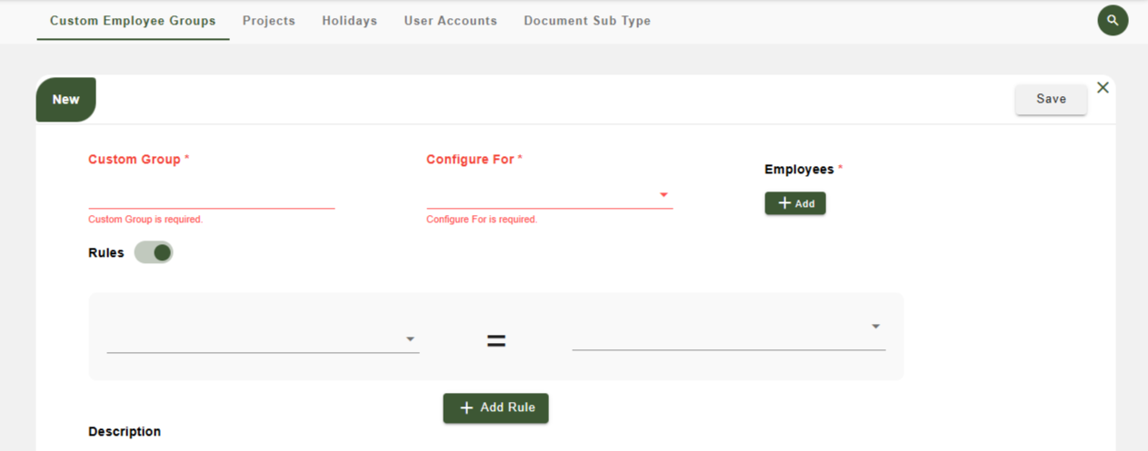Custom Group - Enables the project and activities for a selected group of employees based on defined criteria, allowing targeted assignment and management.