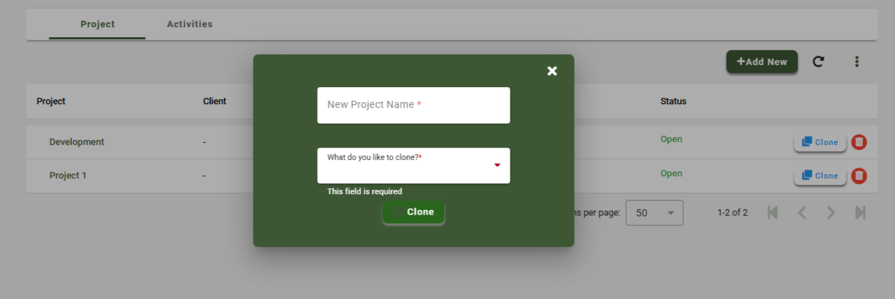 To clone a project, click the Clone button in the project grid. A pop-up window will appear where you can enter the New Project Name and choose whether to clone Project Only or Project with Activities. Click the Clone button to complete the process.