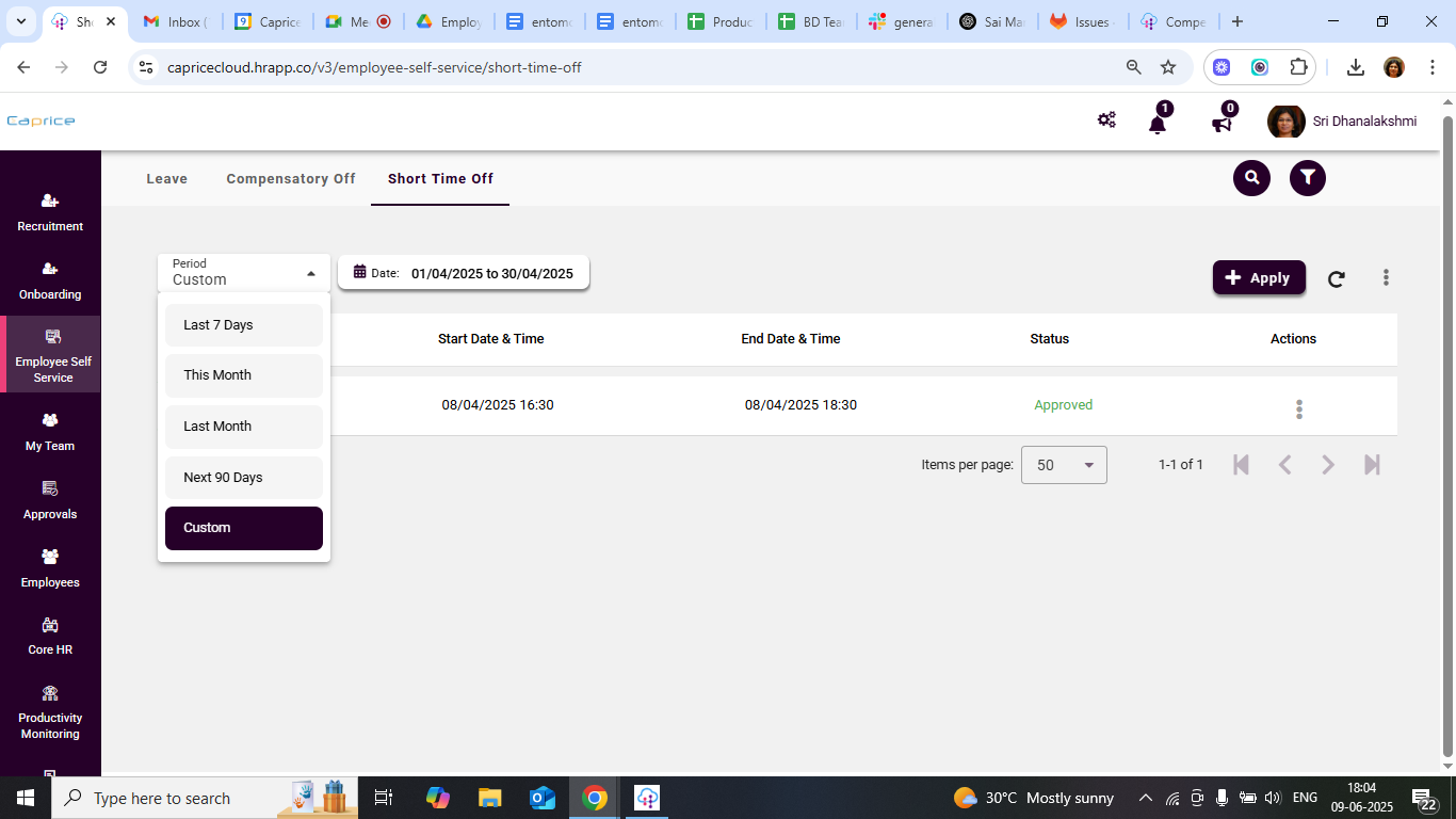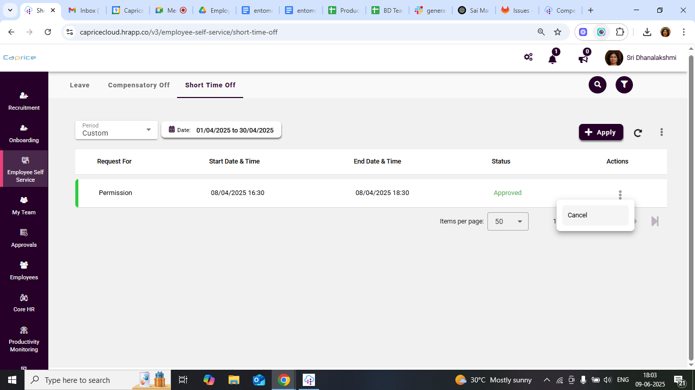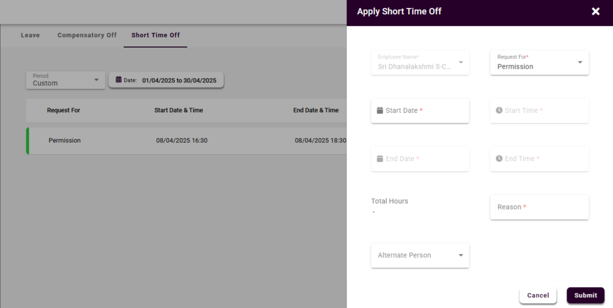 Short Time Off (Permission) feature under Employee Self Service (ESS) allows employees to request brief time away from work without applying for full or half-day leave. This module is intended for personal tasks such as attending medical appointments, family emergencies, or other short-duration commitments during working hours.