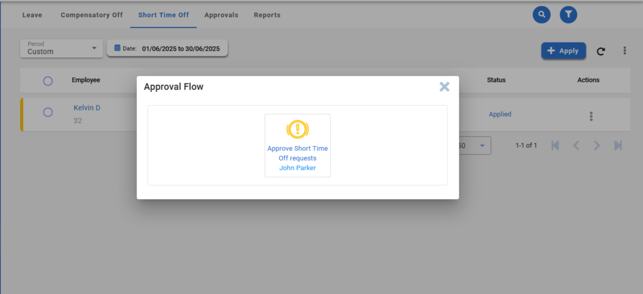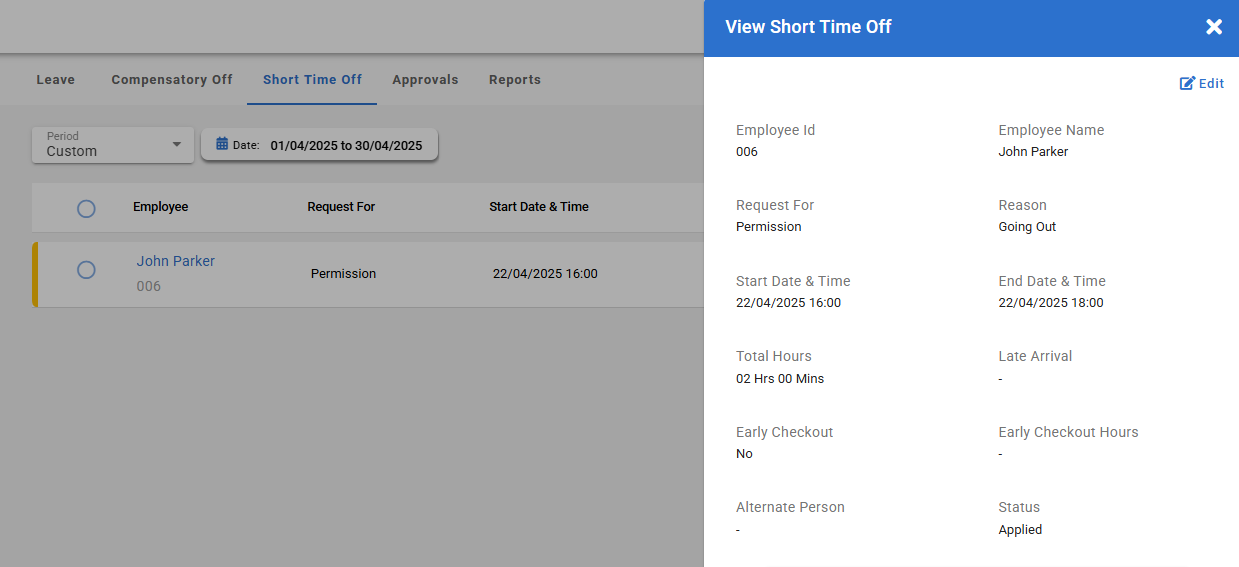 - To view short time off data: Select the record, and a pop-up window will open displaying the applied permission request.