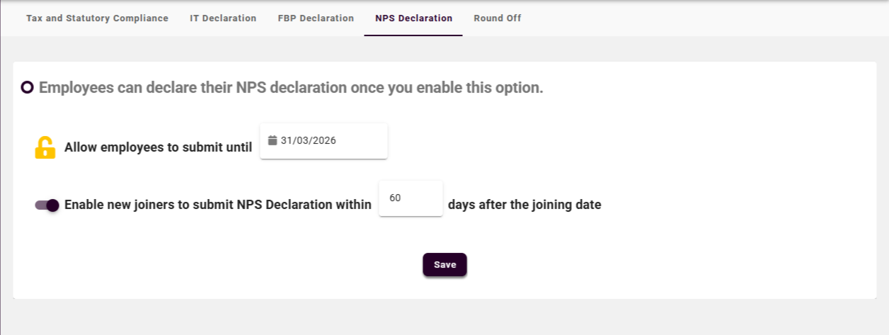 For new employees, enable and configure the number of days (from the date of joining) during which they are allowed to submit their NPS declaration.