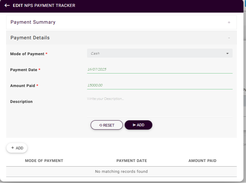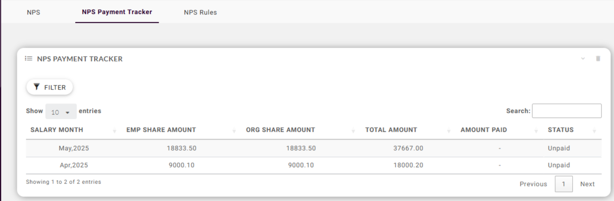After payslips are generated, the NPS contribution amounts are automatically displayed in the NPS Payment Tracker.