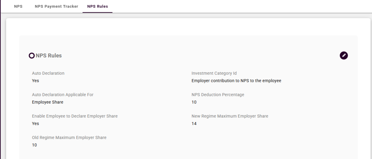 During the payroll processing, the system will automatically deduct NPS based on the configured contribution rates for both employee and employer.