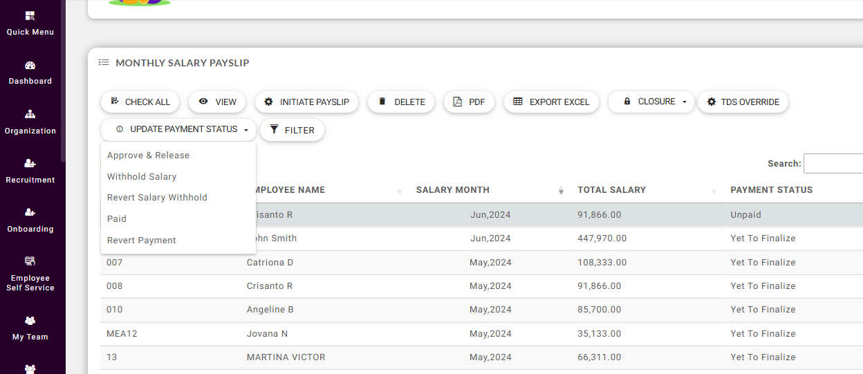 Steps to update Payment StatusThe application offers various payment statuses to help manage and update employee payment workflows efficiently.