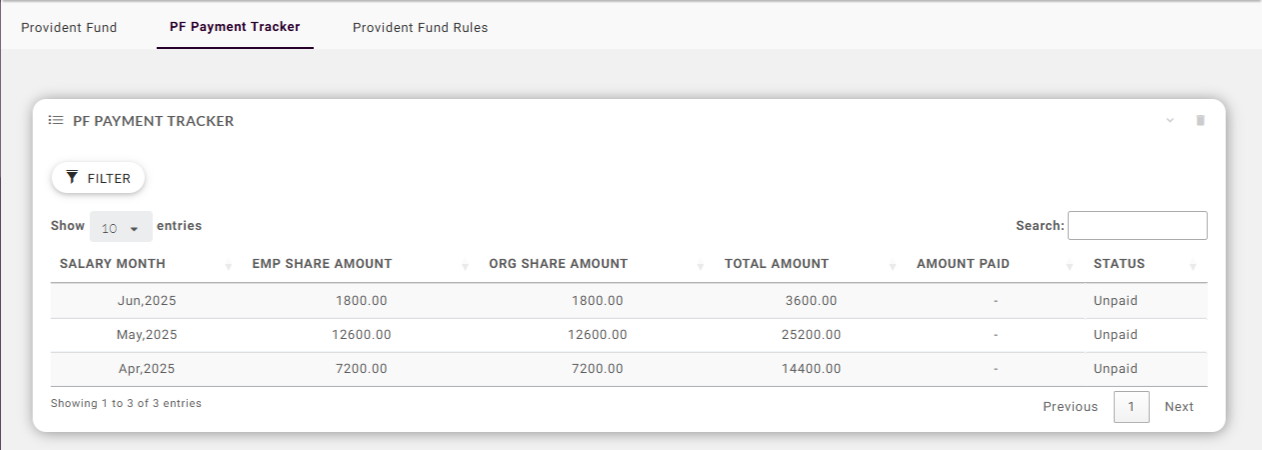 The PF Payment Tracker in payroll helps organizations record and track Provident Fund remittances for each salary month, ensuring compliance with statutory deadlines. It displays the Salary Month, Employee Share Amount, Organization Share Amount, and the Total Amount payable.