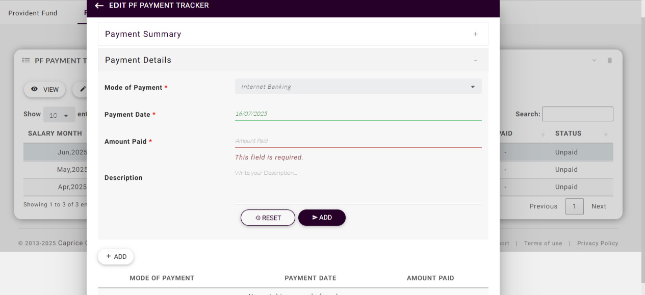 For payment tracking, the module also records the Amount Paid, Payment Status (e.g., Paid, Pending), Mode of Payment (such as Bank Transfer, Cheque, or Internet Banking, Cash etc), and the Payment Date. This allows payroll administrators to reconcile PF liabilities with actual payments made to the Employees’ Provident Fund Organization (EPFO).