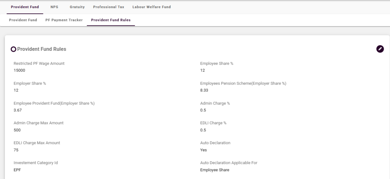 Navigate to Tax and Statutory Compliances → Statutory Components → NPS Rules. Click the Edit Icon. Set the NPS deduction percentage for employees. The auto-declaration and investment category are pre-defined in the system as per statutory compliance. ...