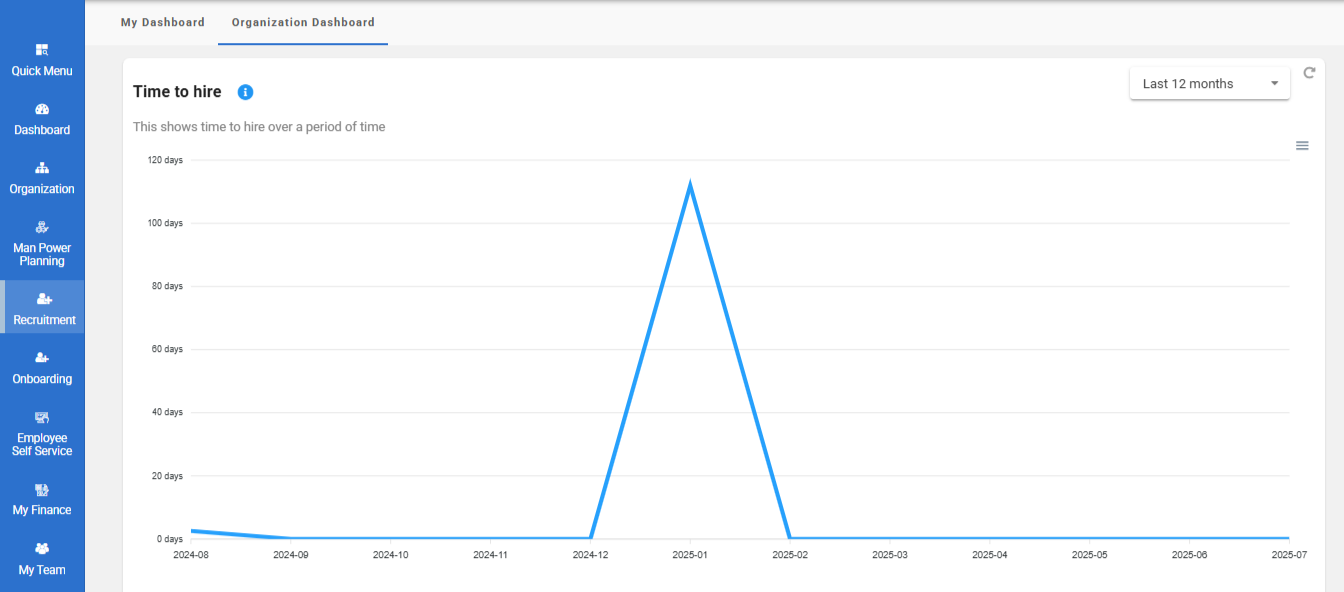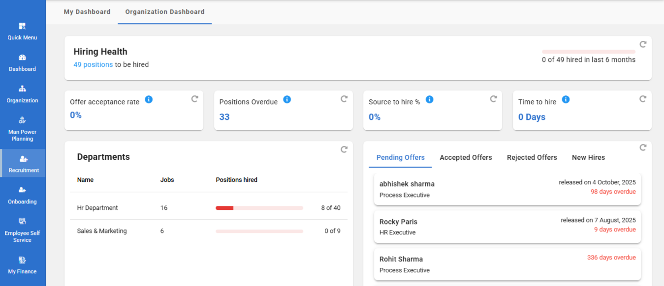 The Organization Dashboard offers a consolidated view of recruitment activity across the company. It is accessible to Admin/Recruiter users to monitor overall recruitment performance.