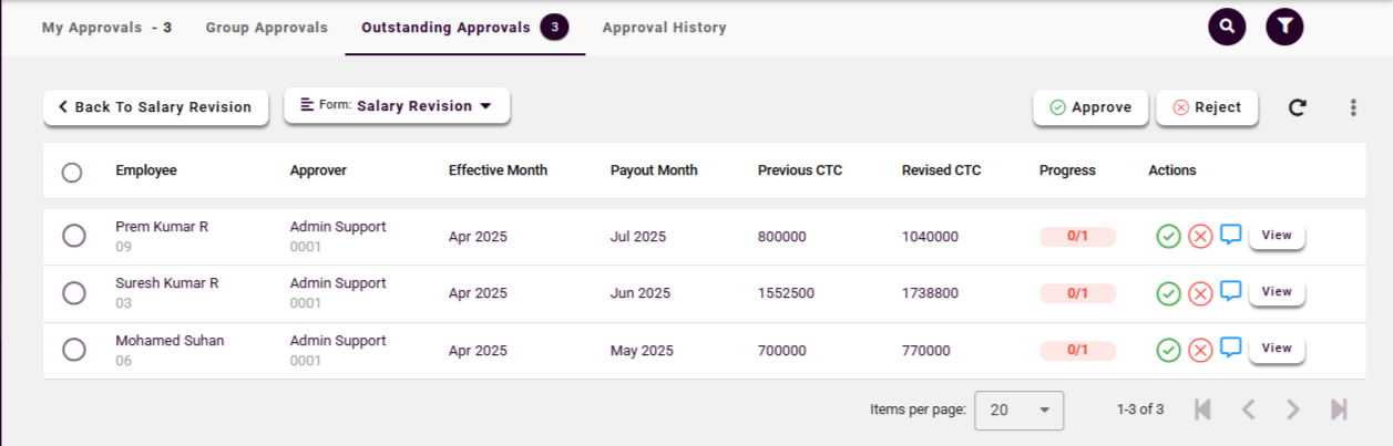 Designated approvers can view all the salary revision requests that are pending approval. They have the ability to take action on these requests, either by approving or rejecting them based on the information provided.