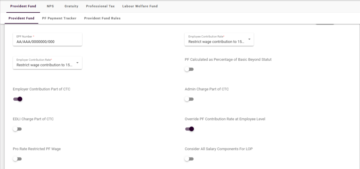 You can also select whether to allow overriding the PF contribution rate at the employee level during salary configuration for that specific employee.