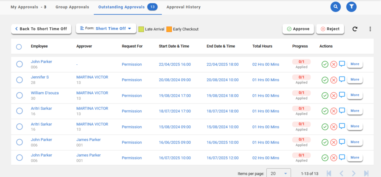 Managers or approvers can view all the short time off requests that are pending approval for their team members. They have the ability to take action on these requests, either by approving or rejecting them based on the information provided.