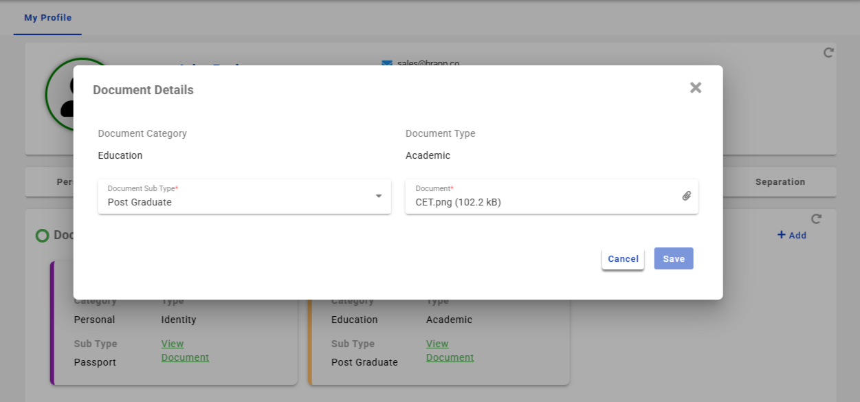 Employee Self Service → My Profile → Document/Identity Documents It allows employees to view and manage important identity and legal documentation details with the document. This section is particularly useful for organizations that require tracking ...