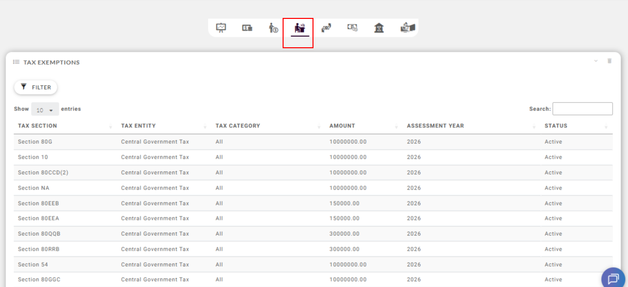 Navigate to Tax and Statutory Compliances → Tax Rules → Tax Section The tax sections for exemptions are pre-defined in the application based on the selected Old or New tax regime. Fig: Tax Section