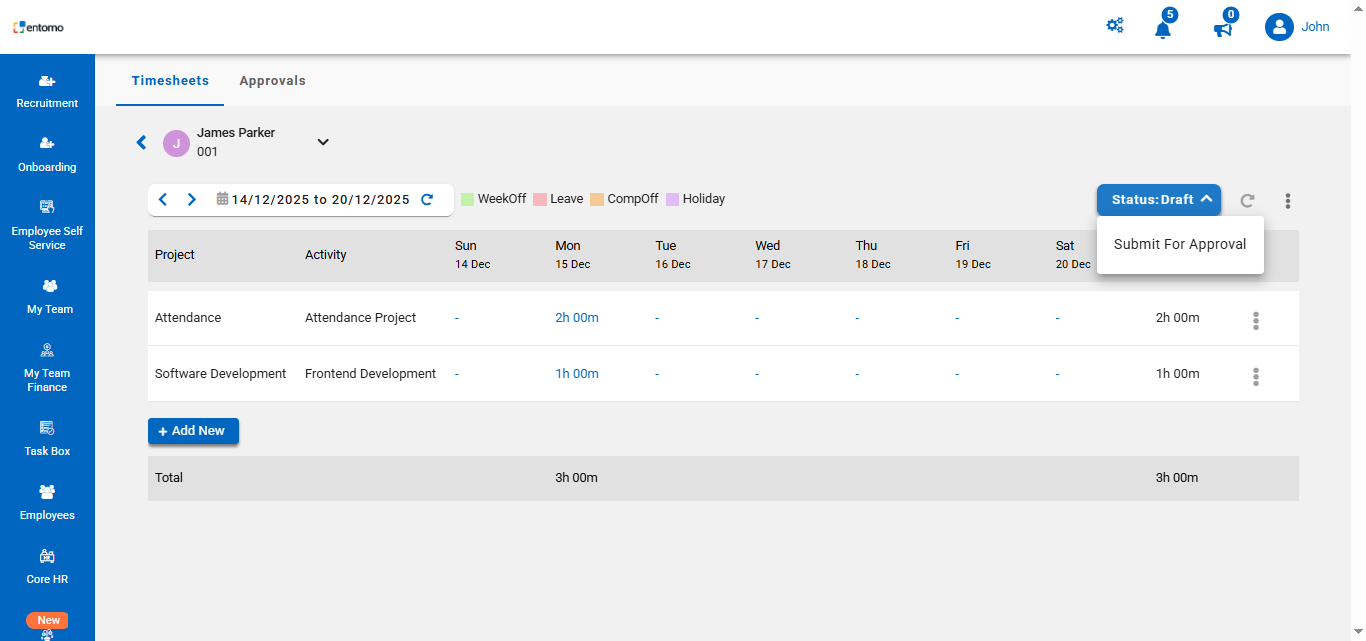 You can draft all projects and activities for the entire week. At the end of the week, submit the timesheet for approval by clicking the Status and selecting Submit for Approval