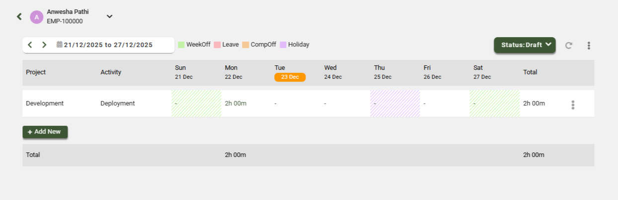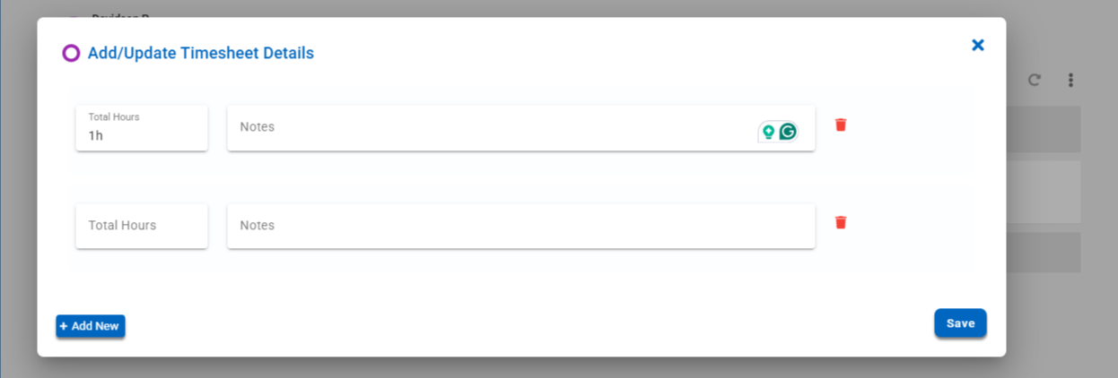 To add additional hours or notes for the same project and activity, click + Add New, provide the details, and click Save.