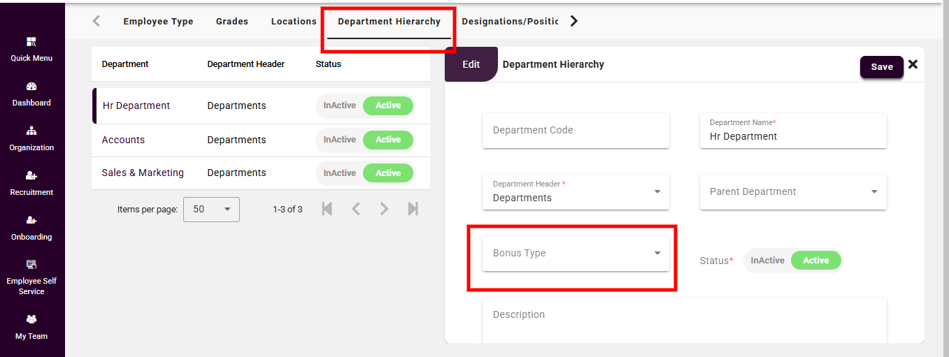 After creating the Bonus Type, it must be associated with the applicable department by navigating to CoreHR → Org Structure → Department Hierarchy.