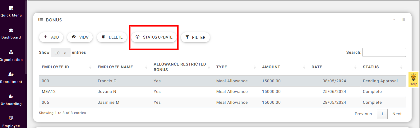 The status is updated to Approved after the first-level approval and changed to Complete once the second-level approval is completed. Only after both levels of approval are obtained will the bonus amount be considered for payroll calculation; otherwise, it will remain marked as Pending Approval.