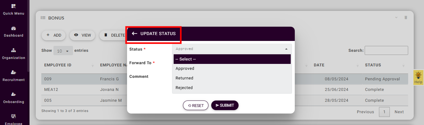 In the Status dropdown, select "Approve" to approve the bonus, or "Reject" to reject the bonus.