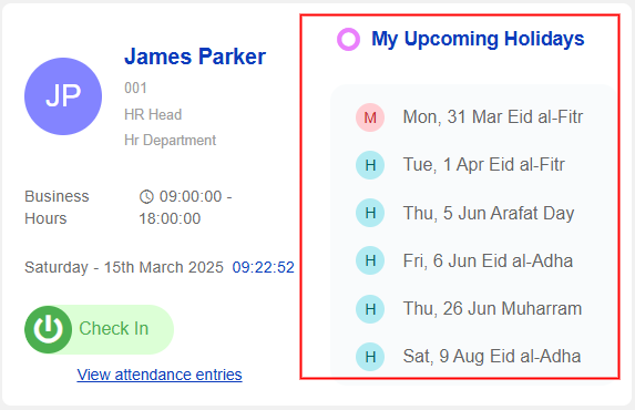The Holiday widget shows you the upcoming holiday based on your assigned holiday calendar. It helps you stay updated on scheduled days off, enabling better planning of your work and leave schedules.