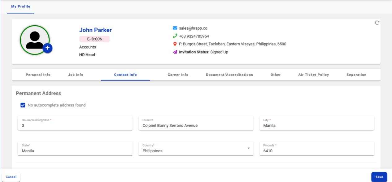 If your details are already entered and you wish to make changes, click the Edit icon located at the top right corner of the contact Info tab. After updating the necessary fields, click Save at the bottom right corner.
