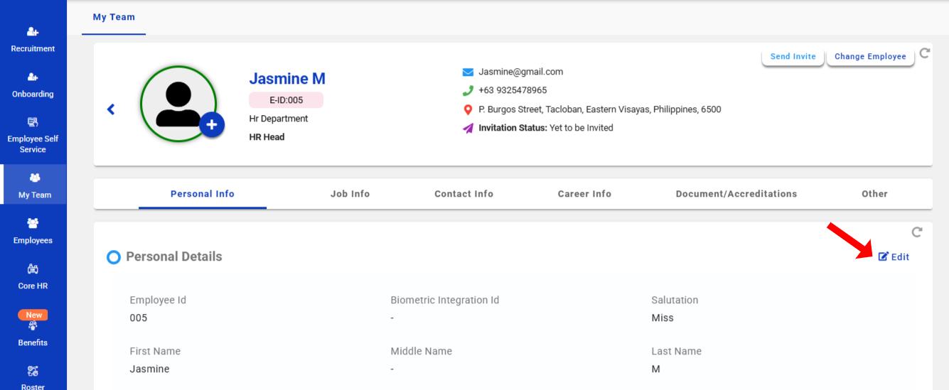 - Once on the employee profile, you can edit the necessary details by selecting the appropriate tab. The profile includes multiple tabs such as Personal Info, Contact Info, Job Info, and more.