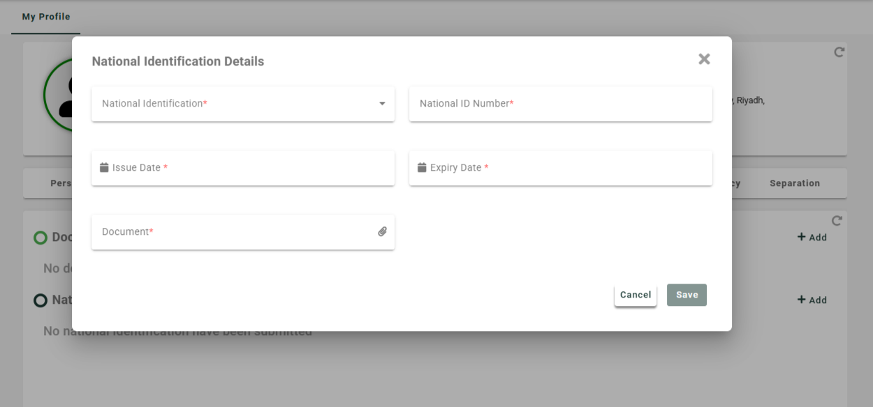 - Select the appropriate National identification and upload the relevant document and Issue date and Expiry date.