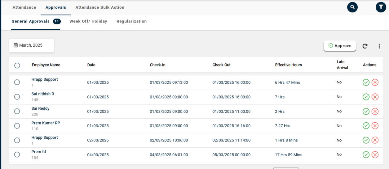 General Approval – This tab displays all the attendance data except for Week Off/Holiday attendance and Regularized attendance, available for approval.